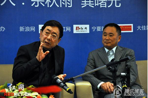銀川書博會期間,龔曙光董事長(右)和余秋雨先生(左)就文明傳播者的當代使命進行對話。